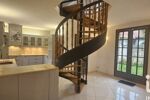 D’une surface de 141,45 m² (200 m2 hors loi Carrez), la maison s’organise autour d’une pièce de vie centrale généreuse, avec cheminée à insert, et rythmée par un escalier architectural qui structure les volumes et signe l’identité du lieu.