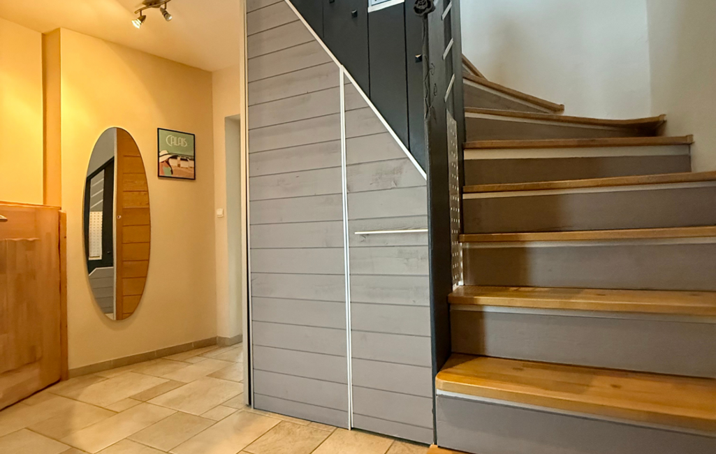 Au rez-de-chaussée, une entrée avec rangements dessert une belle pièce de vie lumineuse d’environ 50 m² avec salon/séjour et cuisine ouverte équipée, une buanderie, un bureau ou chambre ainsi qu'un WC indépendant.