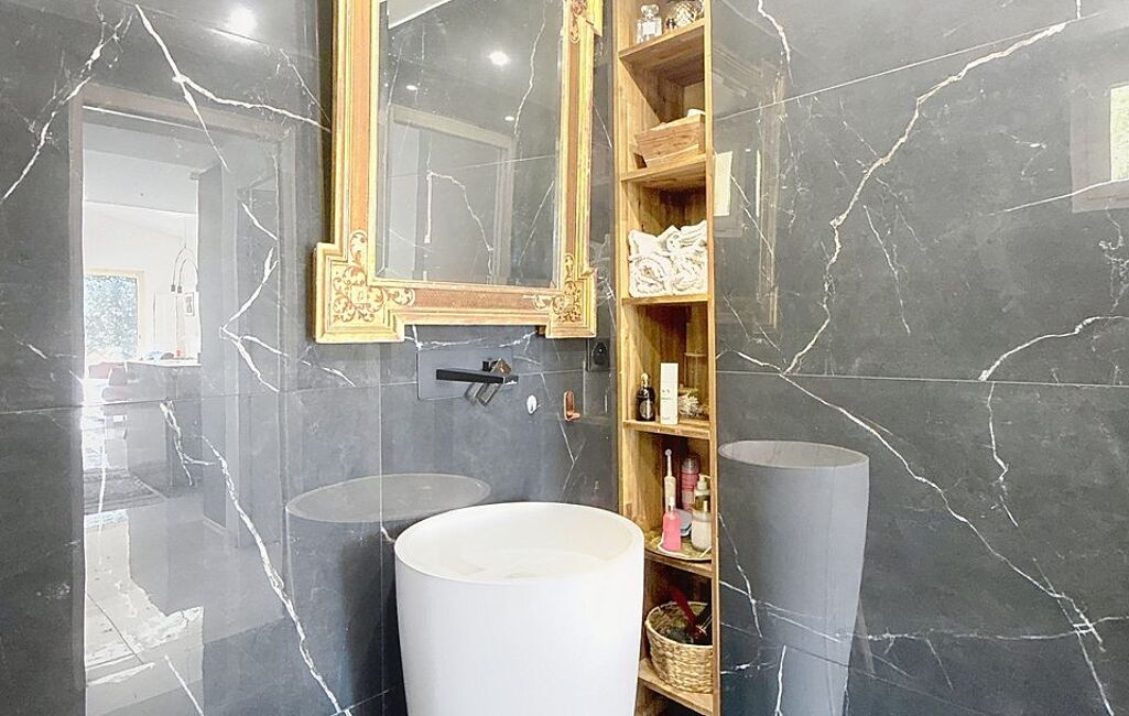 En rez-de-jardin, un salon distribue deux chambres aux prestations confortables. L’une dispose de sa salle d’eau, d’un dressing et d’un accès direct à une terrasse privative. L’autre bénéficie également de sa propre salle de bains et d’un dressing, offrant une configuration idéale pour une famille ou pour recevoir en toute tranquillité.