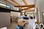 As soon as you enter, you are greeted by a stunning 70 m² cathedral-style living room with high ceilings and large sliding bay windows, giving the impression of living outdoors.