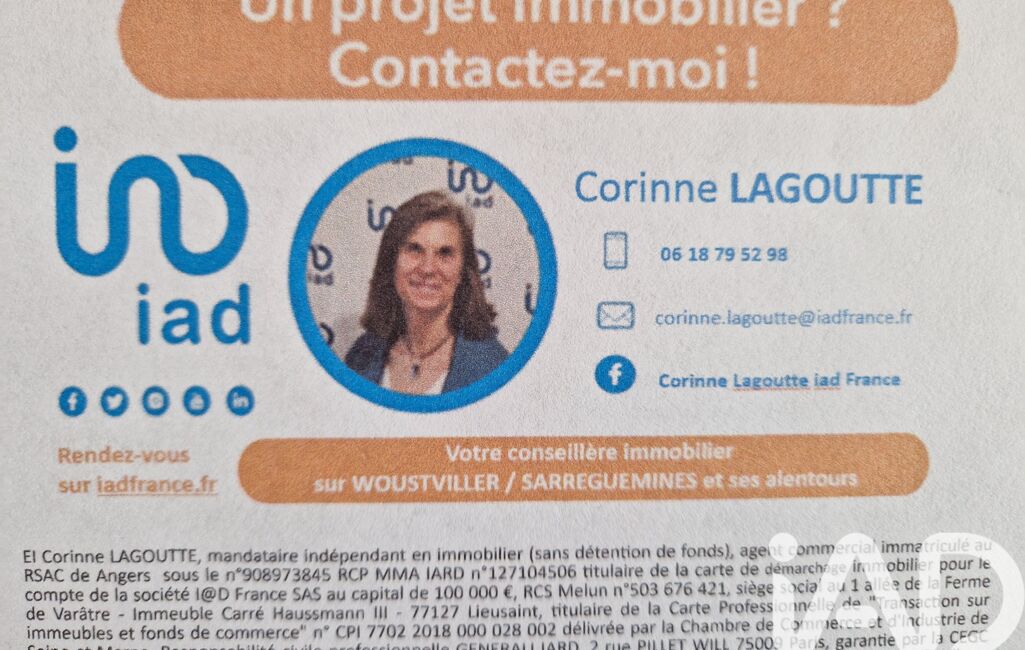 La présente annonce immobilière a été rédigée sous la responsabilité éditoriale de Mme Corinne Lagoutte mandataire indépendant en immobilier (sans détention de fonds), agent commercial de la SAS I@D France immatriculé au RSAC de ANGERS sous le numéro 908973845, titulaire de la carte de démarchage immobilier pour le compte de la société I@D France SAS.