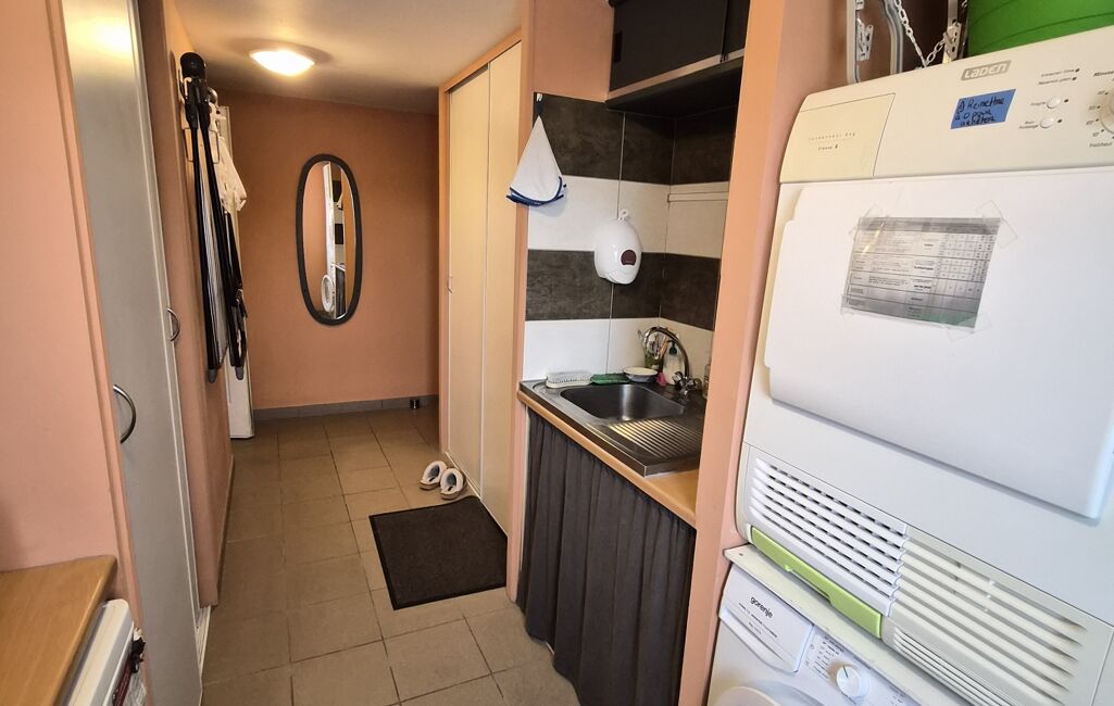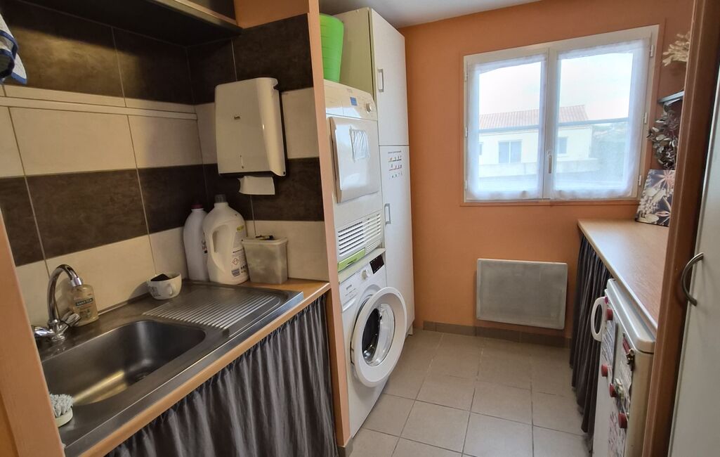 Une entrée avec placard, une belle pièce de vie avec un poêle à bois et deux baies vitrées donnant sur la terrasse, une cuisine équipée et aménagée avec une buanderie attenante.