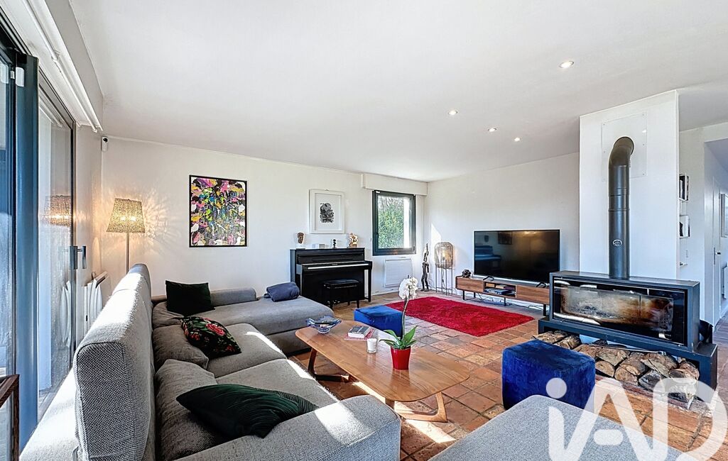 Dès l’entrée, baignée de lumière grâce aux nombreuses baies vitrées, une vue mer s’offre immédiatement et donne le ton. Le vaste salon d’environ 50 m², bénéficie de magnifiques tomettes au sol et d’un poêle à bois, créant une atmosphère chaleureuse et élégante, avec une ouverture naturelle vers les terrasses et le jardin.