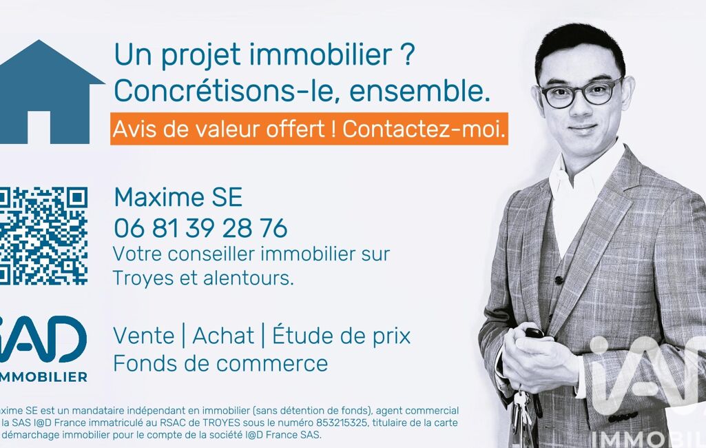 La présente annonce immobilière a été rédigée sous la responsabilité éditoriale de M Maxime Se mandataire indépendant en immobilier (sans détention de fonds), agent commercial de la SAS I@D France immatriculé au RSAC de Troyes sous le numéro 853215325, titulaire de la carte de démarchage immobilier pour le compte de la société I@D France SAS.