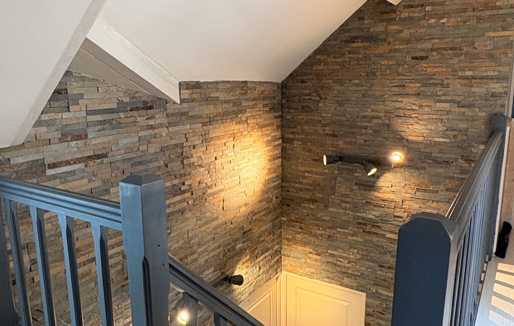 A l'étage un palier dessert 2 très belles chambres, un bureau et salle de bains, WC. Un grenier de 24 m2 environ restant à aménager.