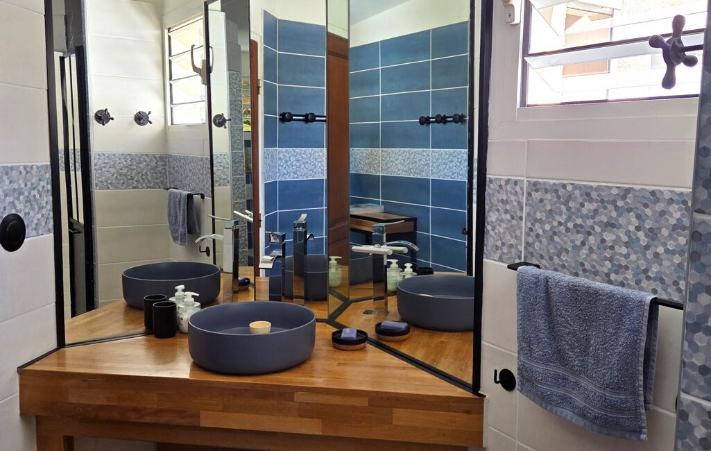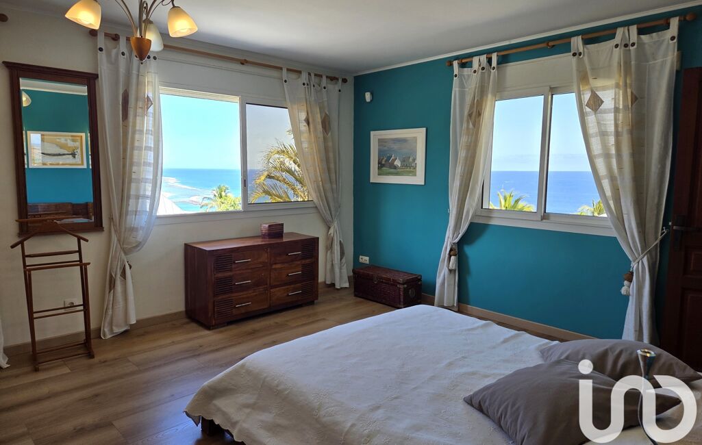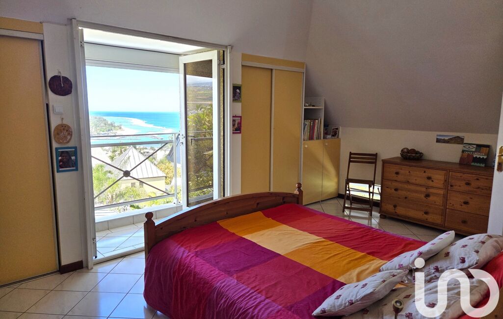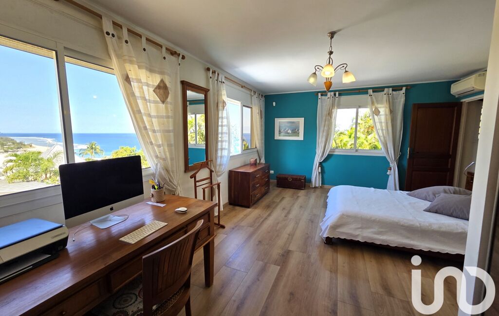 Accédez au 1er étage par un escalier en bois de palissandre qui vous fera découvrir une spacieuse suite parentale lumineuse avec une vue à couper le souffle sur l'entrée du Port de St-Gilles, les plages de Roches noires et des Brisants et l'océan à perte de vue.