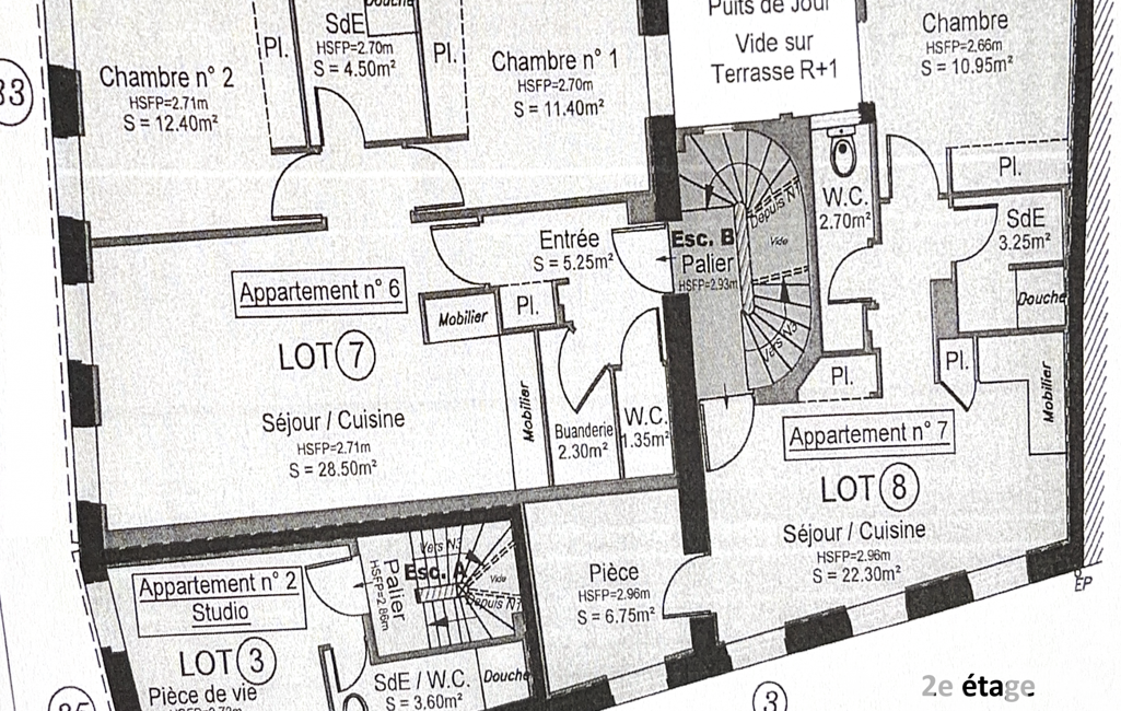 La composition du bien : studio de 32,75 m², T3 de 111,25 m², T3 de 65,70 m², T2 de 45,95 m², T3 de 65,60 m² et T2 de 45,95 m².