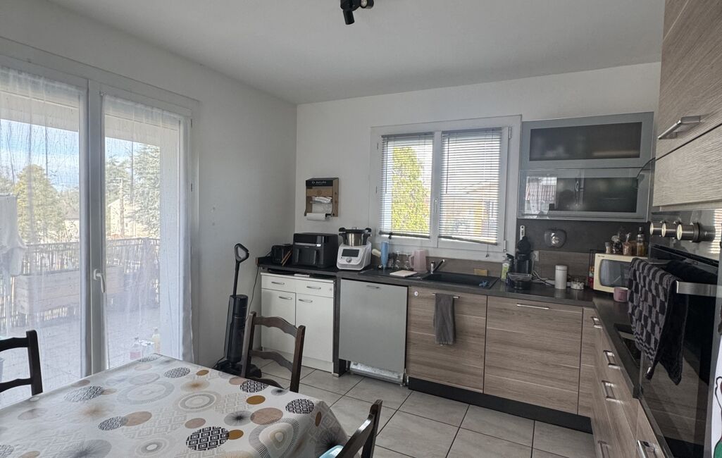 1er étage : pièce de vie lumineuse avec cuisine équipée, terrasse avec balcon, 3 chambres, salle de douche, WC indépendants. Poêle à granulés pour le confort.