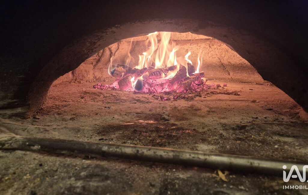 Cuisine professionnelle équipée, four à bois avec extraction en toiture, espace de stockage.
