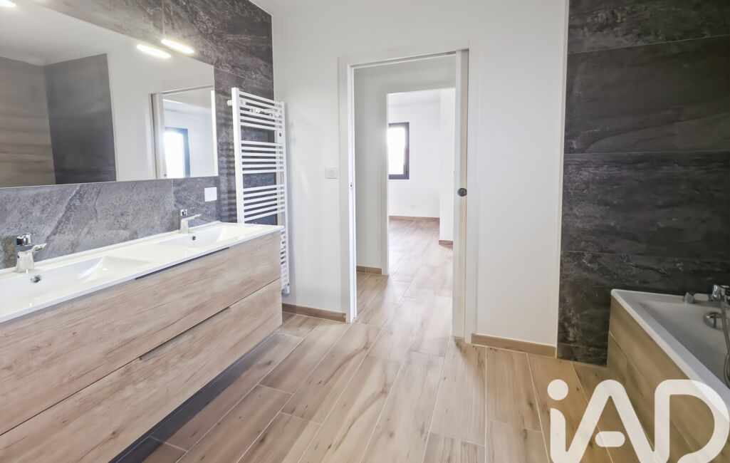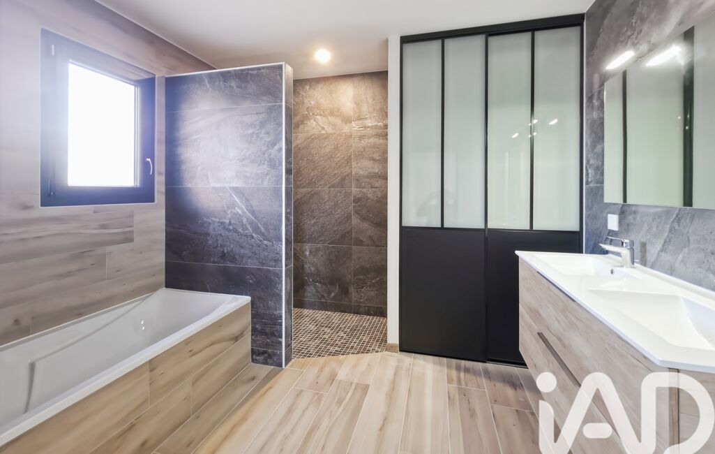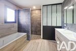 La villa dispose d’une suite parentale avec un dressing aménagé et une salle d’eau comprenant une douche à l’italienne et une simple vasque. Deux autres chambres avec rangements intégrés viennent compléter l’espace, accompagnées d’une salle de bains élégante équipée d’une baignoire, d’une douche à l’italienne, d’un meuble double vasque avec rangements, d’un sèche-serviettes et d’un WC suspendu indépendant avec lave-mains et fenêtre.