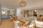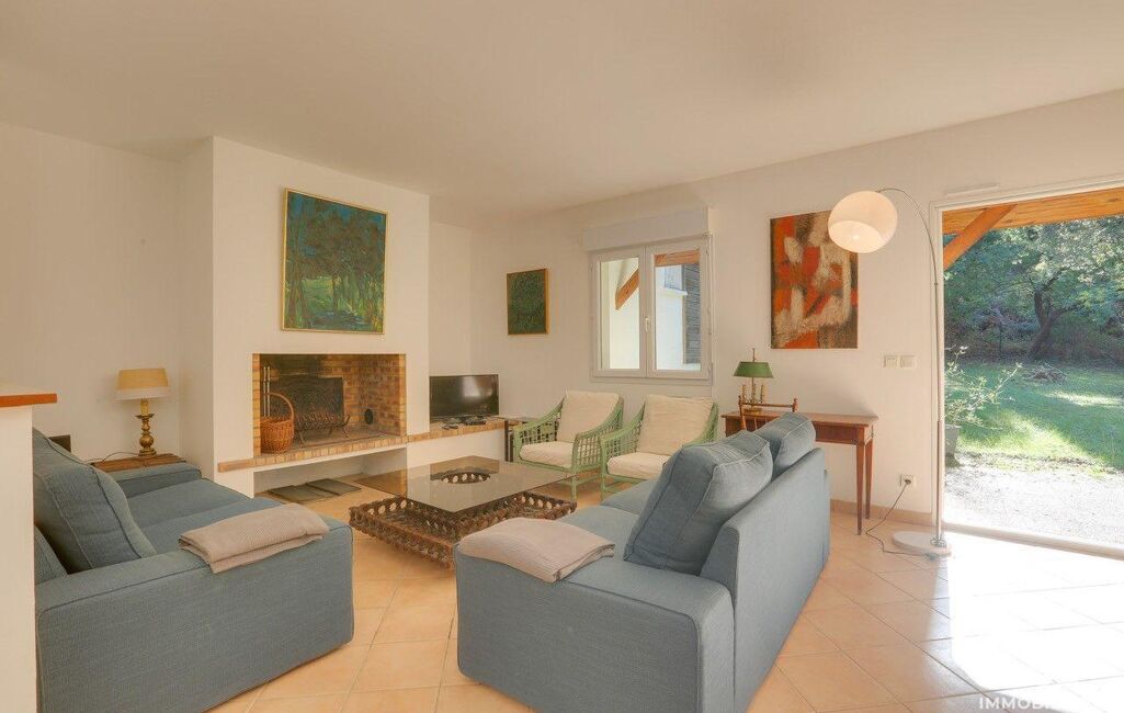 Elle se compose d'une entrée séjour salon avec cheminée, cuisine US aménagée ouvrant sur une belle terrasse couverte et un jardin ouest, 1 chambre avec SDE et placards, 2 chambres avec placard, 1 chambre, 1 SDB / WC, 1 WC lave-mains, dégagement avec placard et meuble à chaussures, 1 cellier, 1 garage.