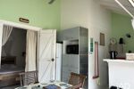 Il est composé d'une entrée sur une loggia avec cuisine, une chambre qui peut être aménagée en salon, d'une chambre cabine et une chambre à l'arrière avec une terrasse couverte donnant sur le jardinet. Il est vendu tout équipé.