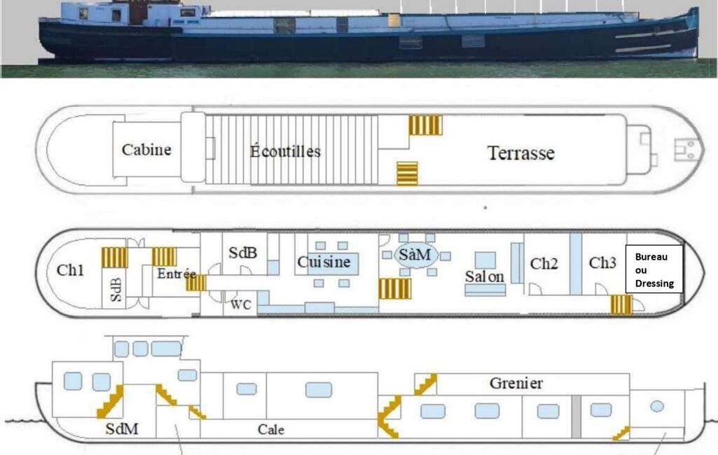 Le salon offre un espace de vie convivial et lumineux, (sur les photos vous y trouverez une projection) avec une cuisine équipée, aménagée et fonctionnelle. Les 3 chambres spacieuses dont une suite parentale dans la cabine du marinier (douche, vasque et WC).