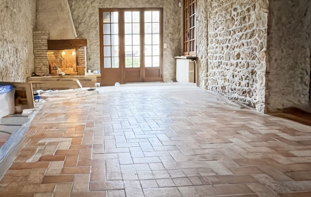 Au rez-de-chaussée, une grande pièce de vie avec murs en pierre apparente, sol en tomettes et cheminée, bénéficiant d’une belle luminosité grâce aux ouvertures sur le jardin.