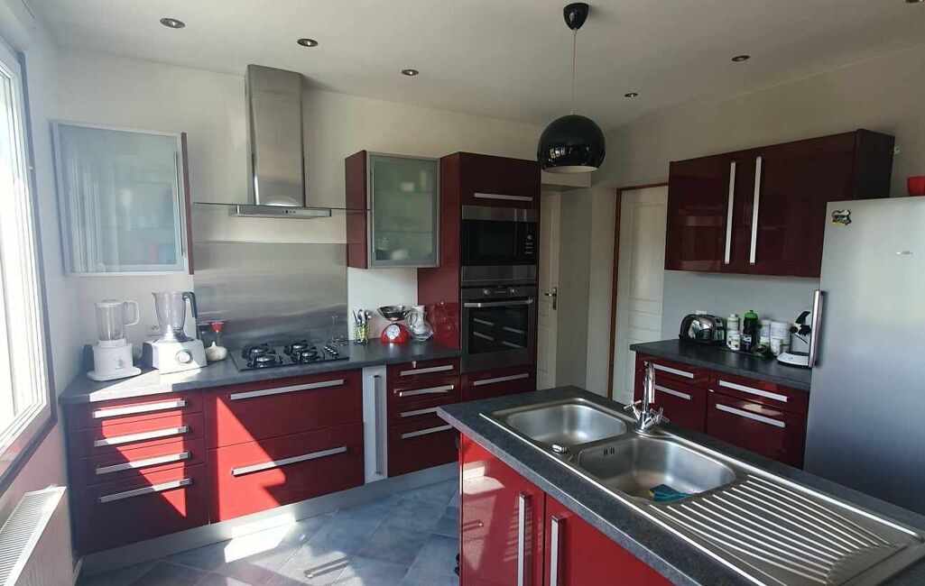 Celle-ci dispose au rez-de-chaussée d'une grande entrée desservant un bel espace de vie ouvert sur une grande cuisine équipée avec son ilot central.