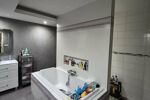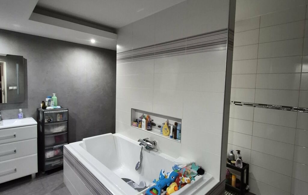 Une magnifique salle de bain avec sa grande baignoire, sa douche à l'italienne et son évier ainsi qu'une très grande chambre de 19m² environ.