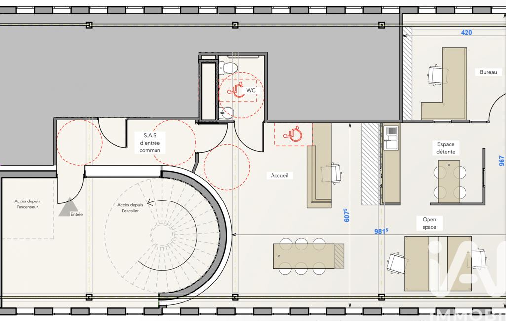 80 m2 de bureaux aménageables avec un espace d'accueil, un WC, un open space très lumineux, un bureau indépendant et un espace kichenette.