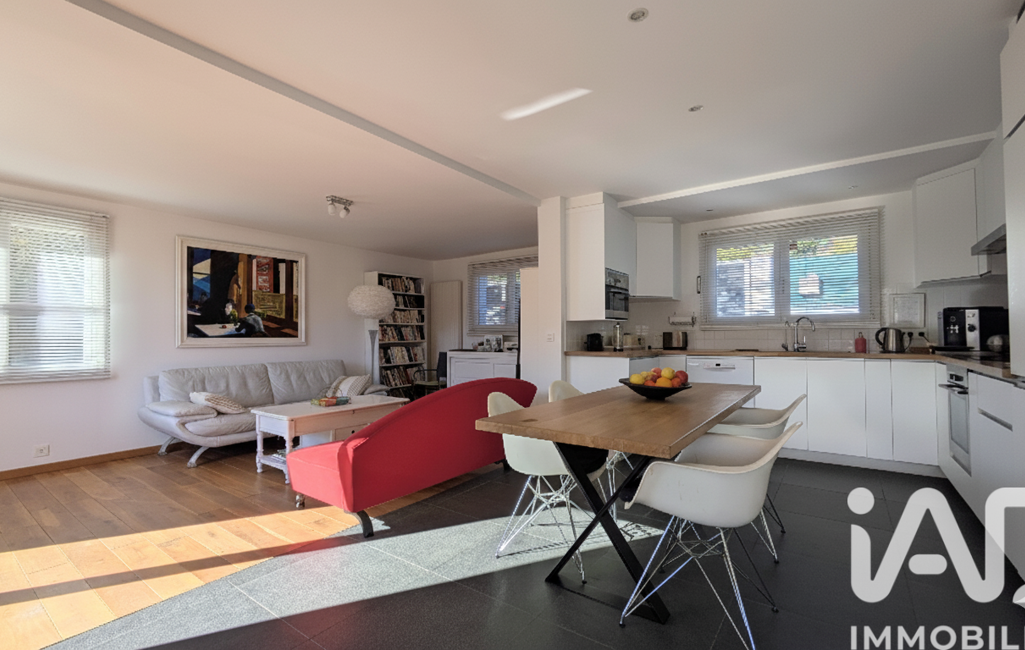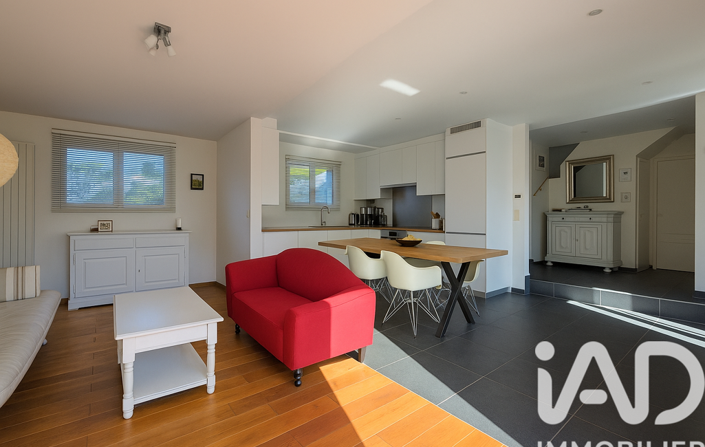 La grande pièce de vie, baignée de lumière grâce à ses ouvertures, réunit un salon chaleureux, une salle à manger conviviale et une cuisine ouverte moderne qui invite au partage.