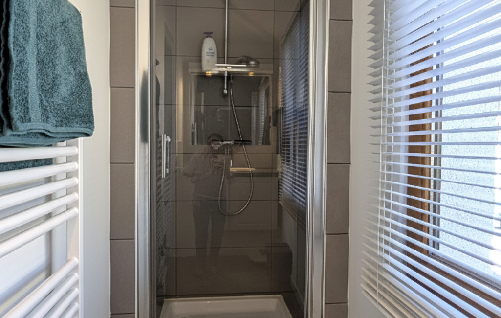 The bedroom offers a peaceful atmosphere, complemented by a modern shower room and separate toilets.