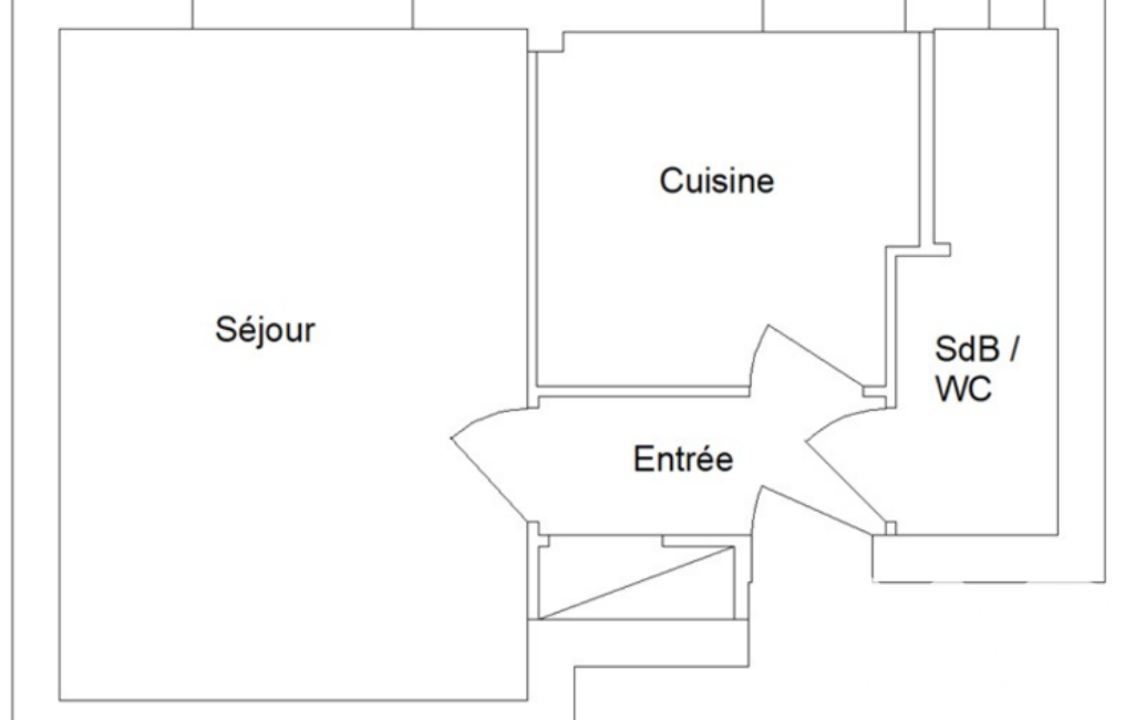 Entrée et séjour sur parquet, cuisine avec carrelage, salle de bain WC et baignoire.
