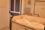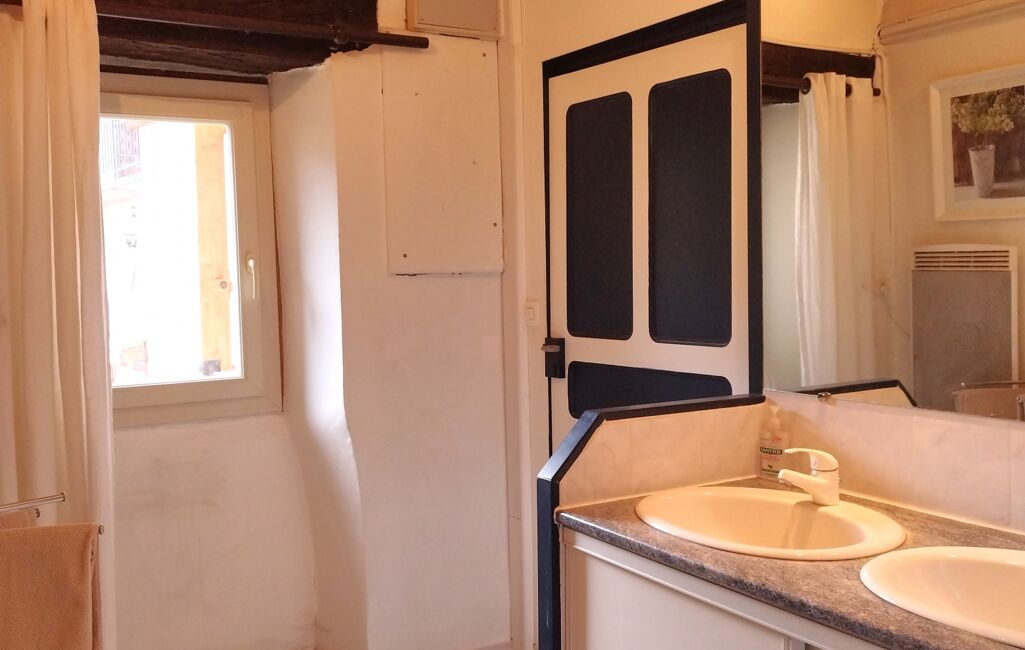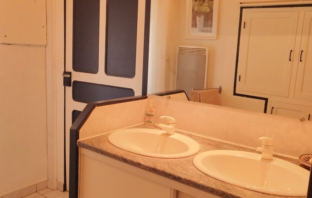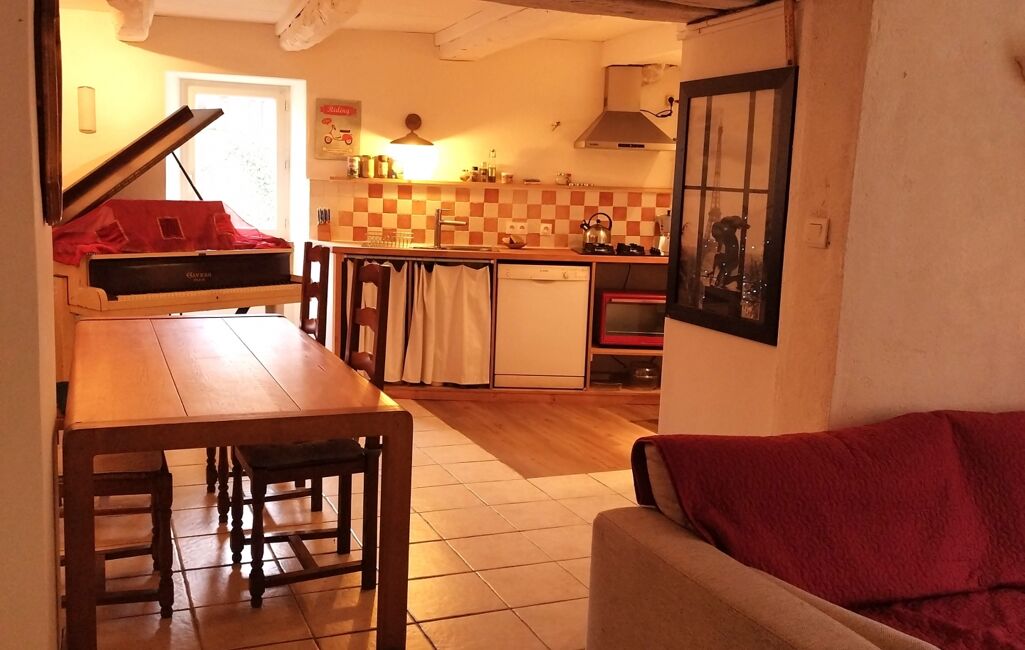 Accès par l’extérieur à la partie rénovée : salon cosy, cuisine équipée avec espace repas, salle d’eau (douche, WC, double vasque).