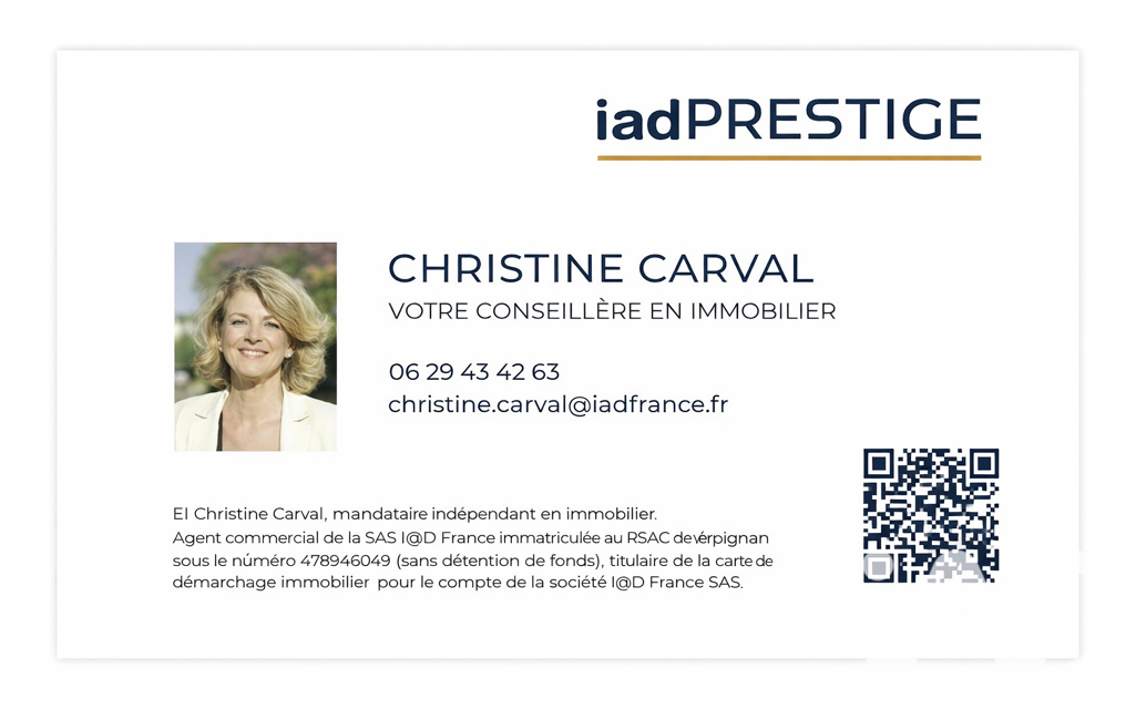 La présente annonce immobilière a été rédigée sous la responsabilité éditoriale de Mme Christine Carval mandataire indépendant en immobilier (sans détention de fonds), agent commercial de la SAS I@D France immatriculé au RSAC de Perpignan sous le numéro 478946049, titulaire de la carte de démarchage immobilier pour le compte de la société I@D France SAS.