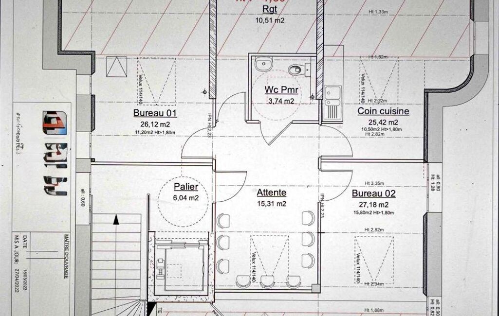 •Bureau 01 : 26,12 m² environ au sol (dont 11,20 m² environ avec hauteur ? 1,80 m)