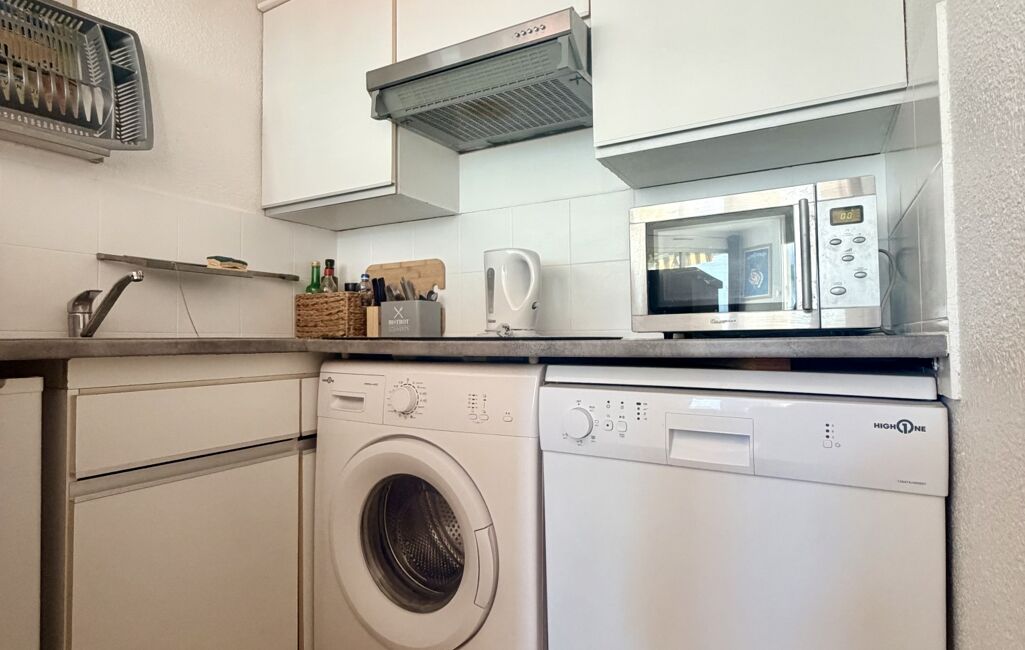 L’appartement se compose d’une entrée, desservant une cuisine entièrement équipée et aménagée ouverte sur un agréable coin salon, offrant un espace de vie lumineux et fonctionnel.