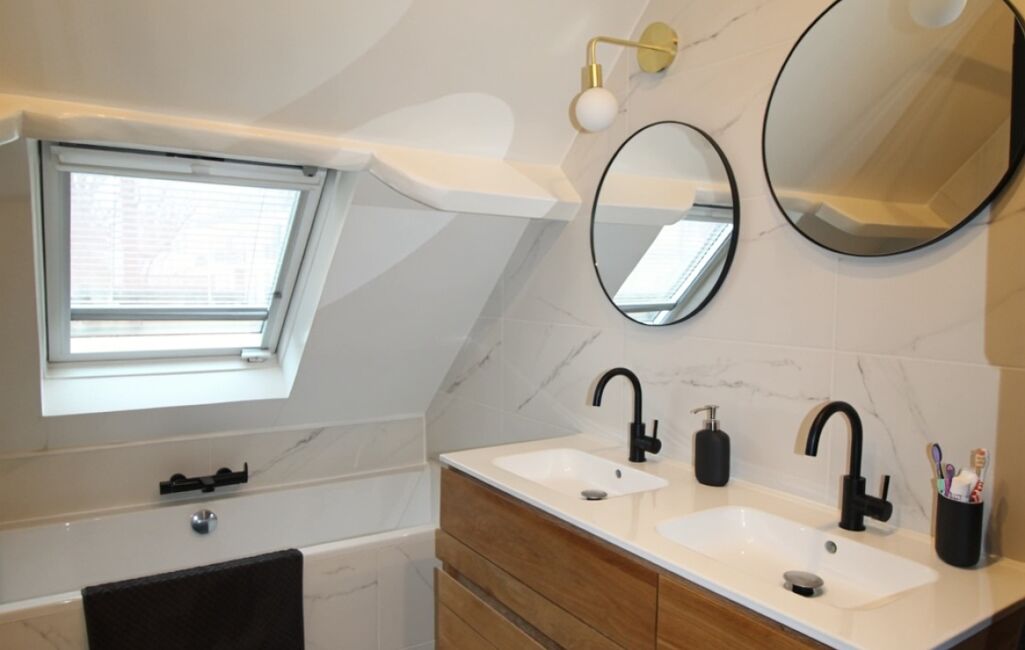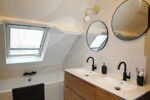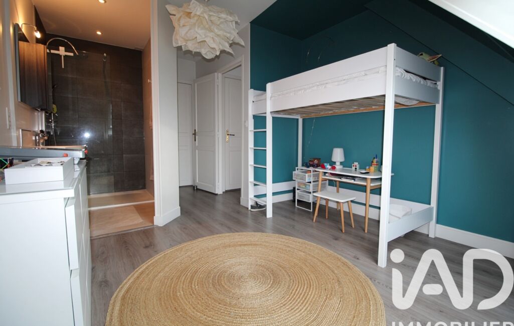 À l’étage, le palier offre un espace bureau. La partie nuit se compose de trois chambres, dont une suite parentale avec salle d’eau privative et espace dressing, ainsi qu’une salle de bains équipée d’une douche et d’une baignoire.