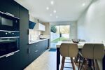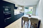 Elle se compose d’un salon séjour , une cuisine équipée , une buanderie , une salle de bain ( en bas ) , wc , 3 chambres , une grande pièce ( jeux , bureau , 4 ème chambre ou autres ) , un jardin .