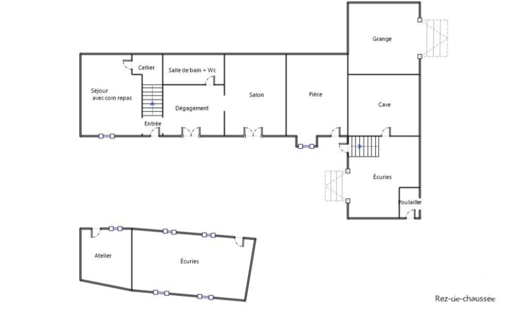 une cave, trois puits, une cuisine d’été, un garage, une terrasse ainsi qu’une grange sur plusieurs niveaux, comprenant notamment une écurie et un poulailler.
