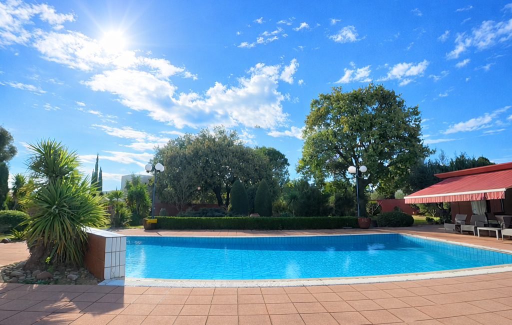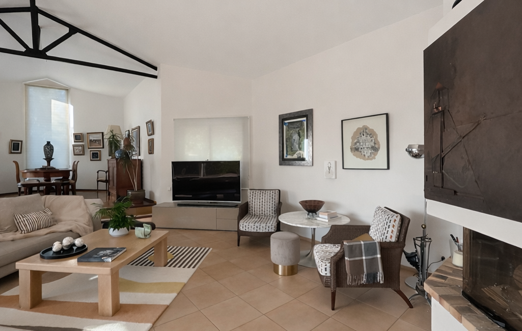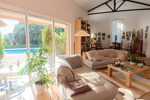Les espaces de réception, généreux et ouverts sur l’extérieur, dialoguent harmonieusement avec un grand parc paysager et une piscine, véritables prolongements de la maison.
