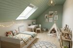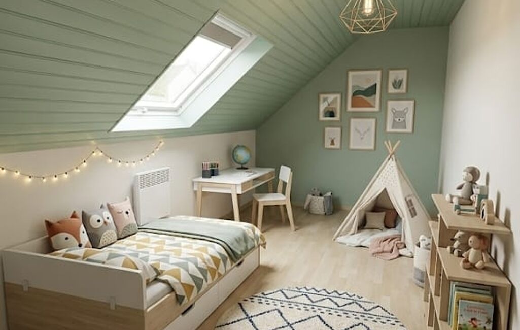 À l'Étage, une mezzanine lumineuse offre un bel espace sous velux, idéal pour un bureau ou un coin lecture. Elle permet d'accéder à une grande chambre avec rangements intégrés et deux chambres mansardées au charme cosy.