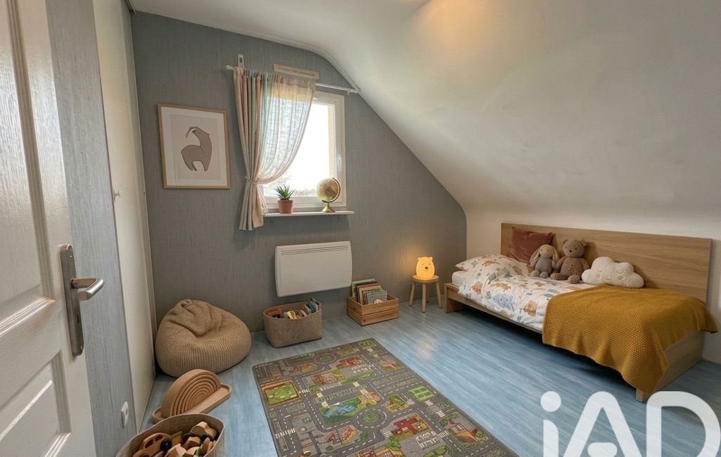 À l’étage, le palier distribue trois chambres, dont deux avec rangements, une salle de bain et un WC indépendant.