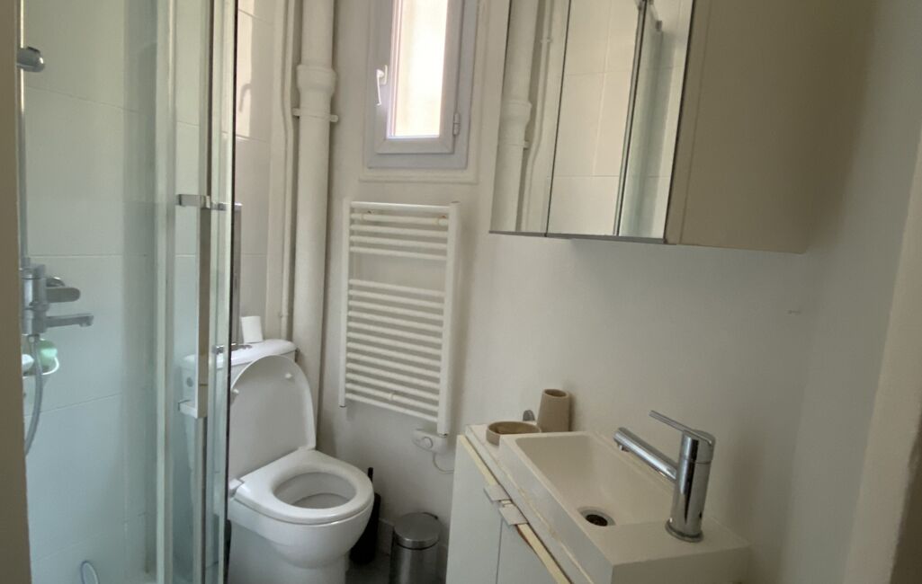 Ce studio est organisé comme un petit 2 pièces avec 4 espaces distincts. Une ENTREE, une CUISINE SEPAREE aménagée et équipée de plus de 7m2 , une SALLE D'EAU avec cabine de douche, lavabo et wc.