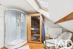 Mezzanine ouvrant sur balcon (espace bureau ou détente), trois chambres climatisées, salle d’eau avec douche et sauna, WC indépendant.