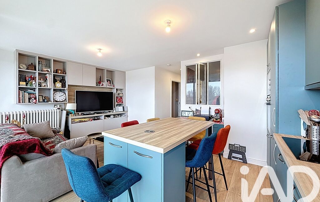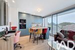 Dès l’entrée, équipée d’un placard de rangement, l’appartement dévoile une pièce de vie lumineuse comprenant un espace salon et une cuisine aménagée et équipée avec îlot central et rangements. La grande baie vitrée à trois ventaux ouvre sur un balcon, apportant luminosité et continuité avec l’extérieur.