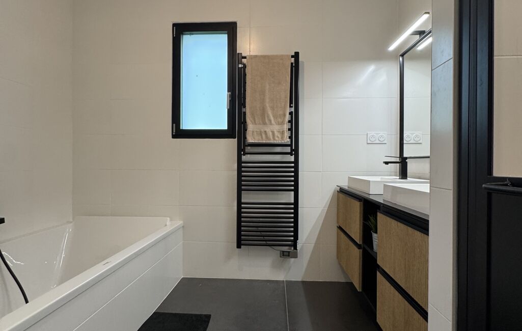 Cette maison contemporaine se distingue par ses lignes épurées et son design soigné. Elle se compose de vastes espaces de vie lumineux et aérés, sans oublier le grand jardin .