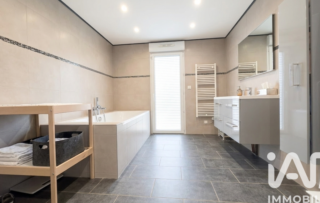 Spacieuse salle de bain de 16 m² avec baignoire et douche à l’italienne, offrant la possibilité de créer une future suite parentale