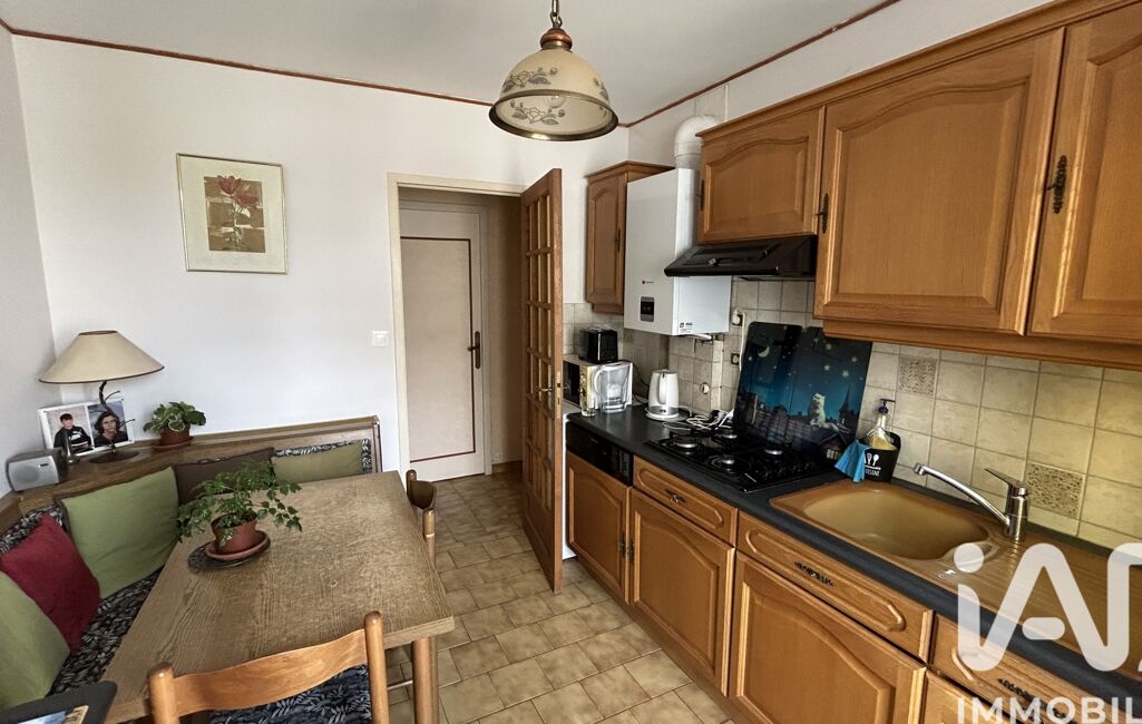 La maison se compose d’un salon-séjour avec cheminée à insert, d’une cuisine aménagée et équipée, de trois chambres, d’une salle de bain, d’une salle d’eau et d’un WC séparé. Un garage attenant dessert deux chambres supplémentaires à l’étage avec WC séparé. La maison est chauffée au gaz de ville et bénéficie du tout-à-l’égout.