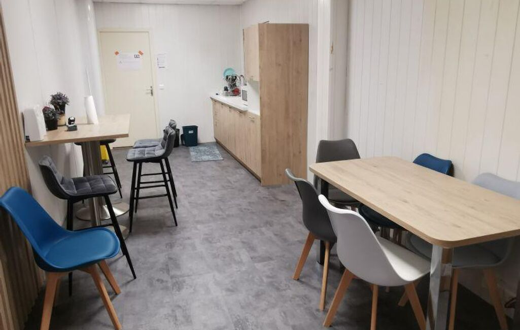 A l étage, grande pièce palière avec plusieurs bureaux, cuisine, WC hommes et femmes.