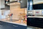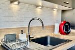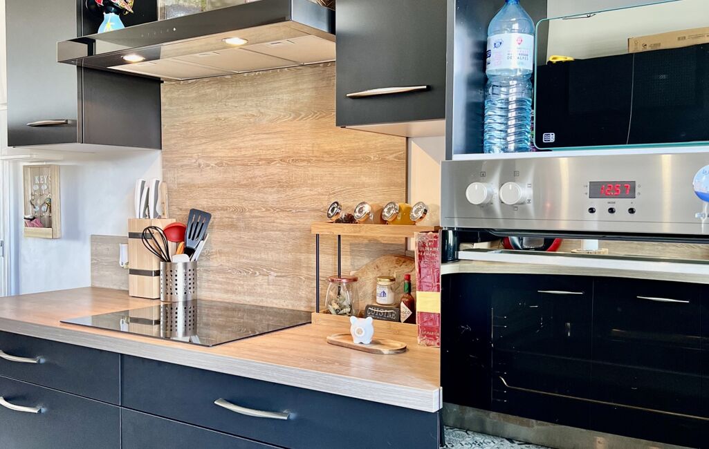 La cuisine aménagée et équipée, moderne et fonctionnelle, s’intègre parfaitement à l’espace.