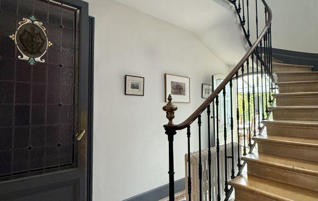 Une magnifique avec cage d’escalier ornée de vitraux mène aux étages et souligne le charme authentique de la maison.