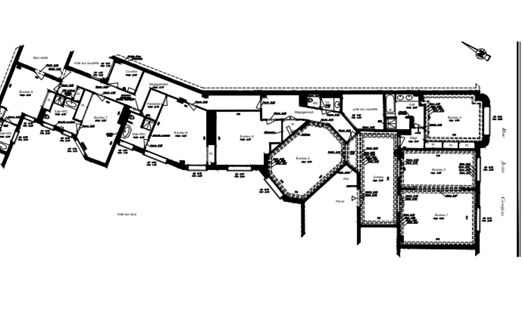 Il se compose notamment d'une vaste entrée de réception, de 8 bureaux distincts, lumineux et bien proportionnés, trois salles de bains/WC attenantes à certains bureaux (héritage de son ancien usage d'habitation), une entrée de service indépendante, un espace cuisine / salle de repos.