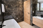 - Une grande salle de bain avec baignoire, meuble vasque et WC,