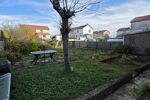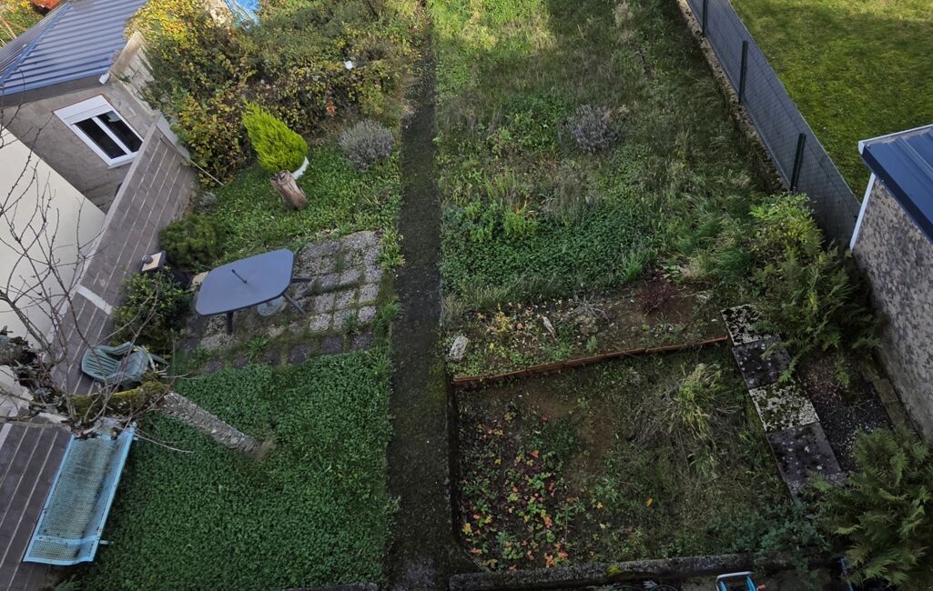 Côté extérieur, un grand garage donnant directement sur un vaste jardin arboré avec plusieurs arbres fruitiers et un cabanon.