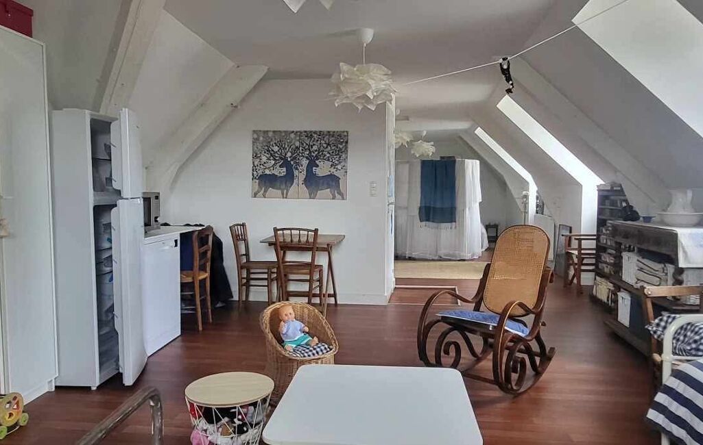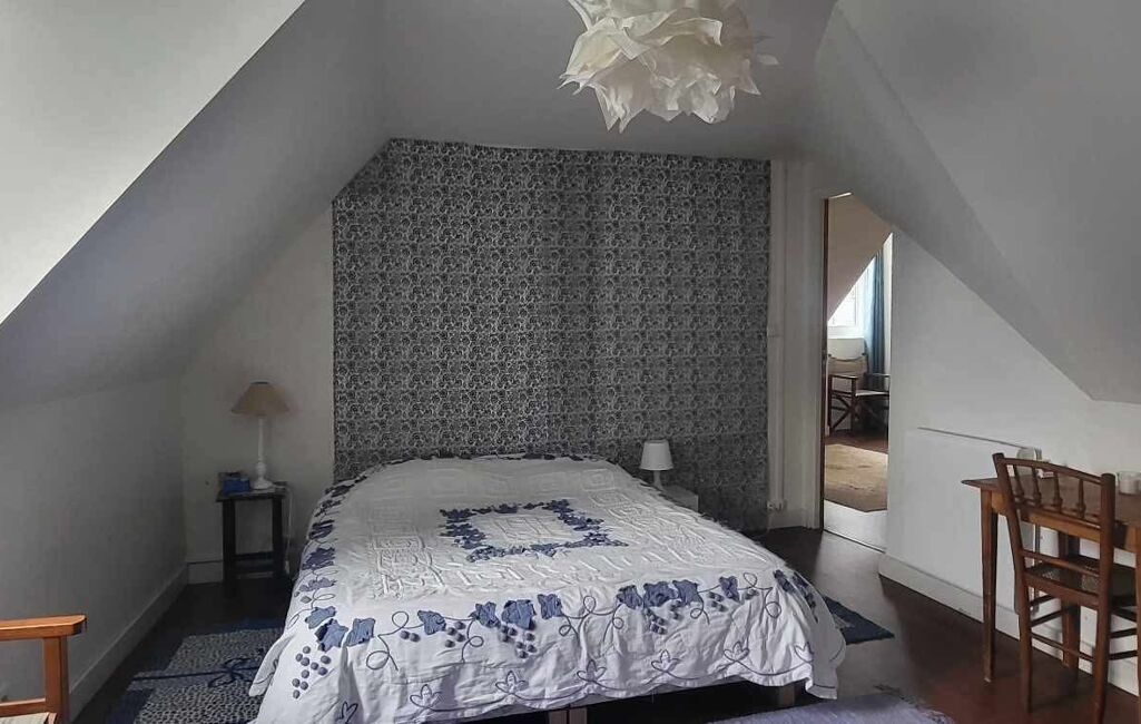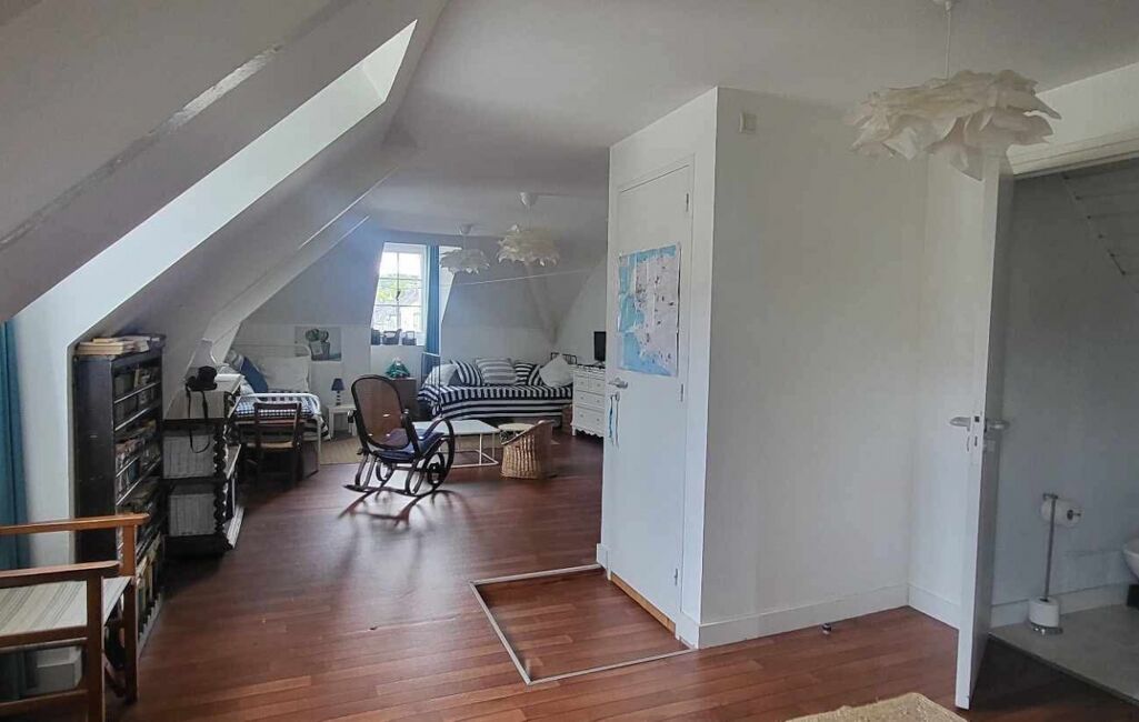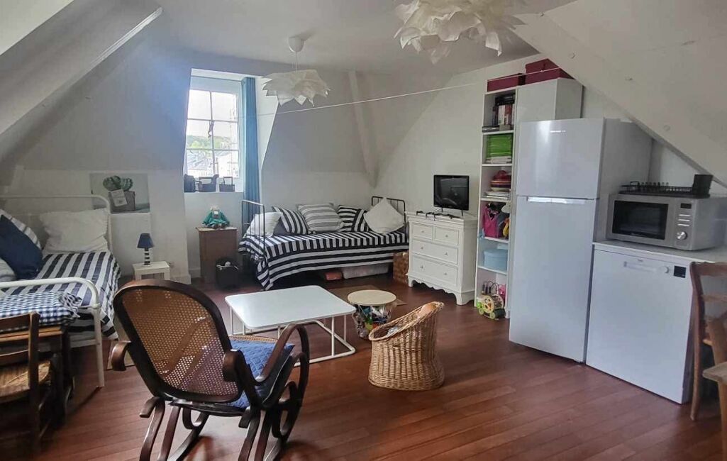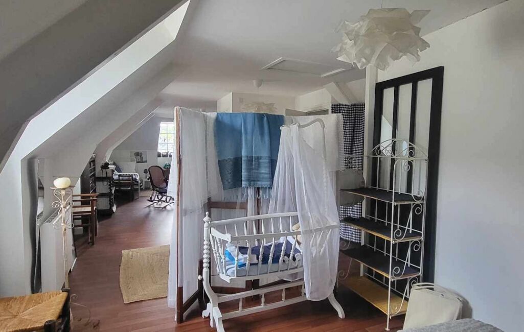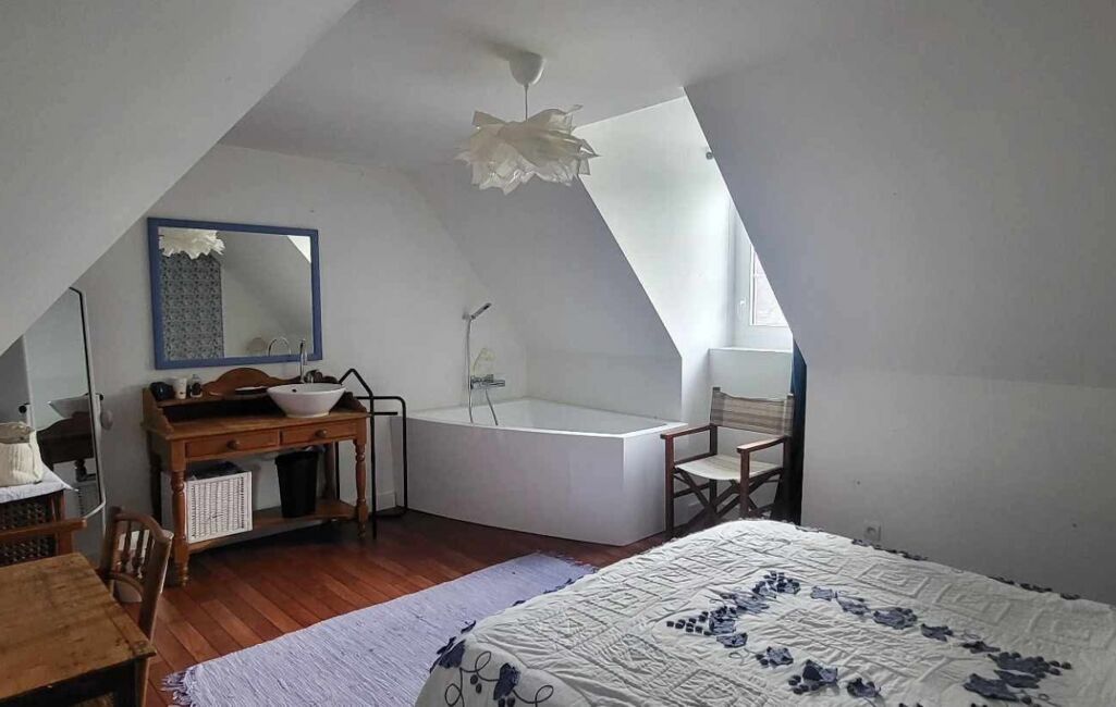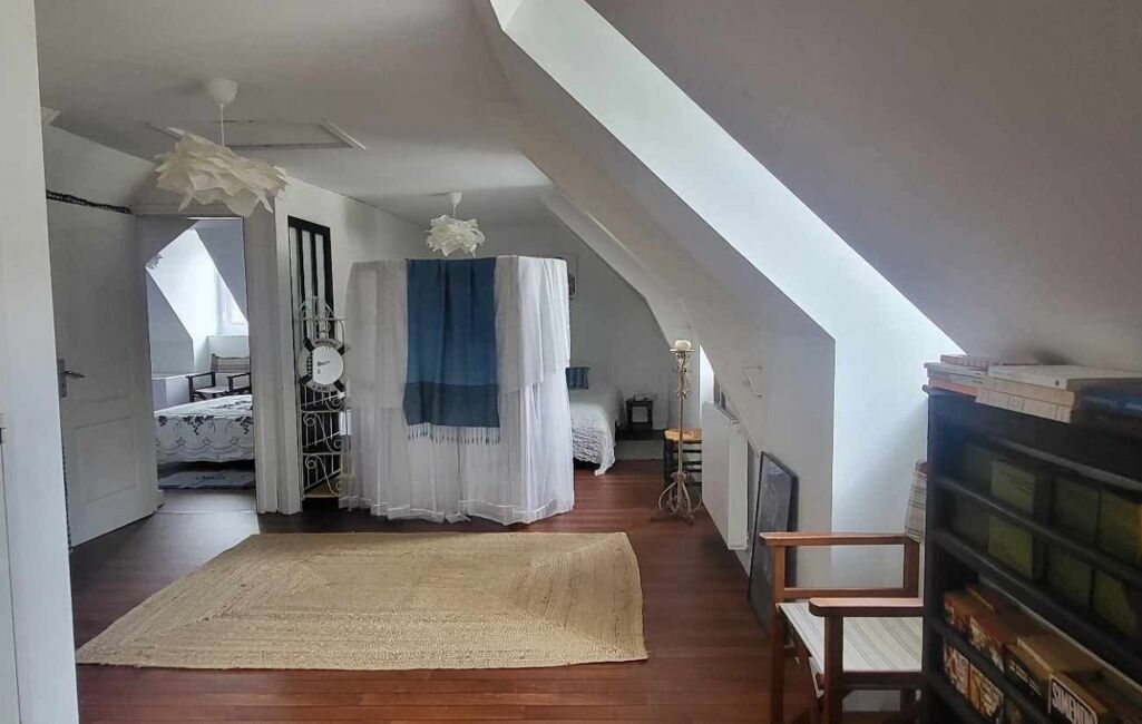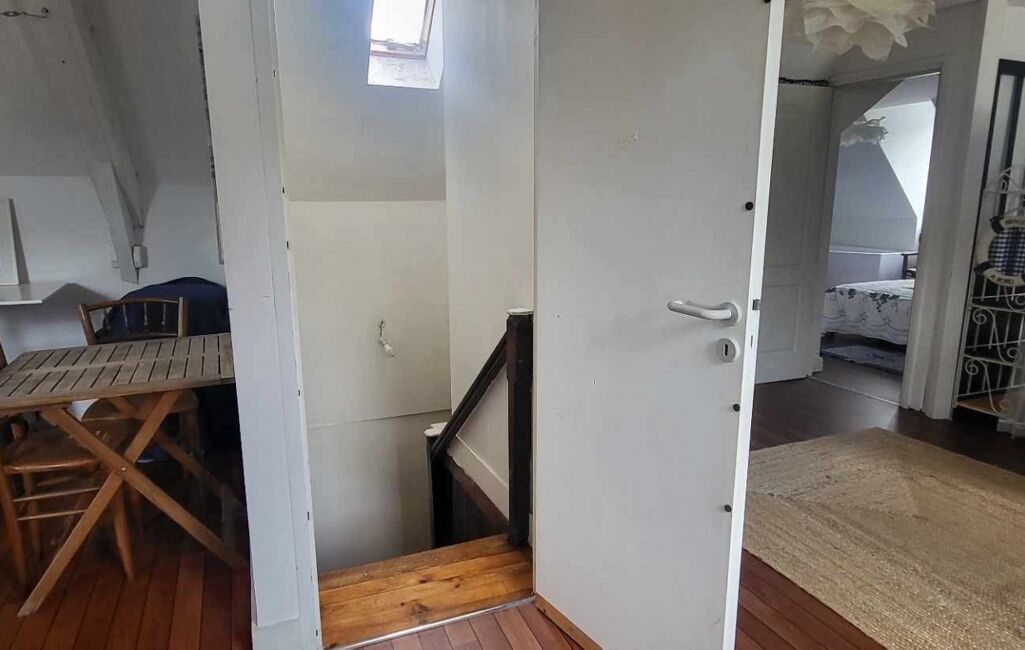 Au premier étage, un appartement comprenant une pièce de vie lumineuse, un WC indépendant, ainsi qu’une chambre avec salle de bain équipée d’une baignoire et d’un lavabo. Un espace cuisine reste à aménager, les arrivées d’eau et électricité étant déjà en place.
