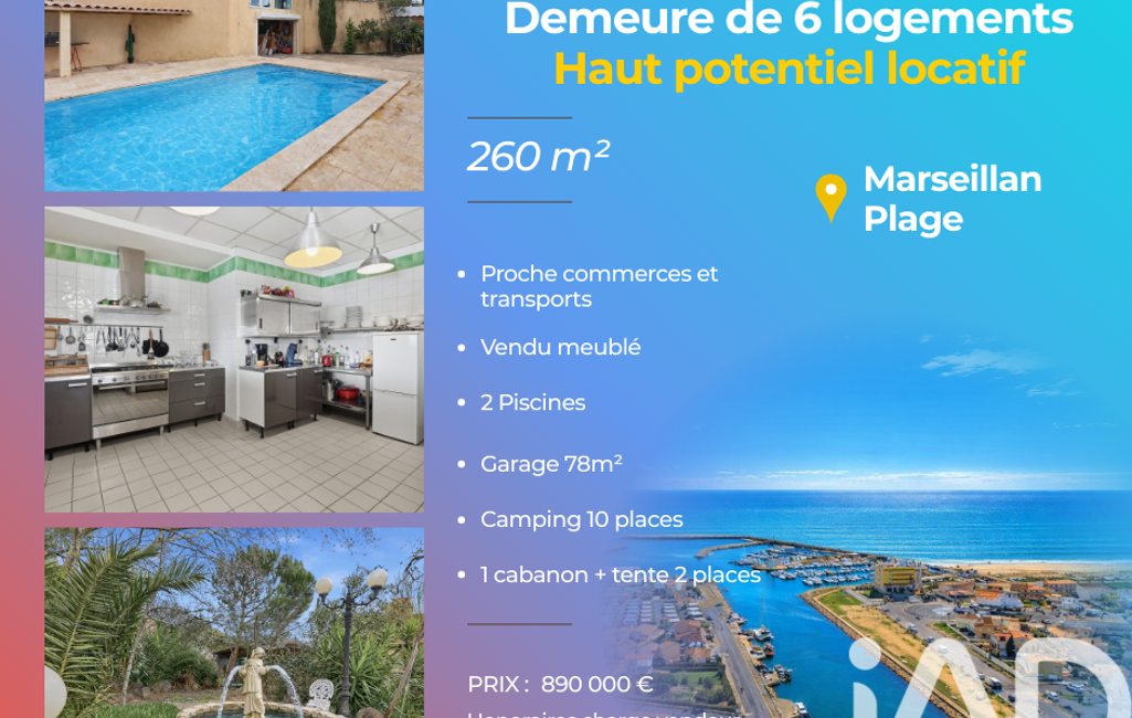 À Marseillan Plage, et 250mètres des plages cette demeure d’exception de 260 m² ne se contente pas d’être un lieu de vie : c’est un véritable outil de création de revenus, pensé dans les moindres détails.