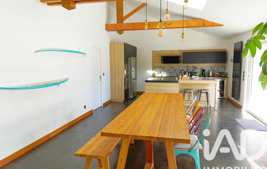 La maison se compose d'une vaste pièce de vie comprenant un salon élégant avec cheminée, une salle à manger mise en valeur par un magnifique plafond cathédrale et des poutres apparentes ainsi qu'une cuisine moderne, fonctionnelle et équipée. De grandes baies vitrées ouvrent sur le jardin exposé plein sud inondant la pièce d'une lumière exceptionnelle.