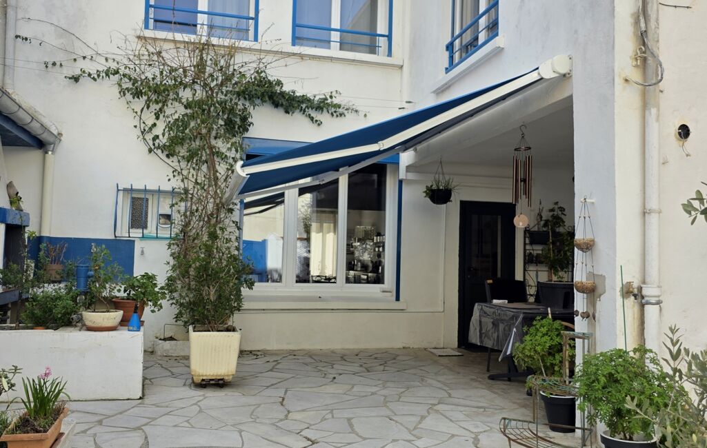 Au rez de chaussée vous profiterez d' une belle cour avec terrasse couverte, un garage ainsi qu' un coin atelier.